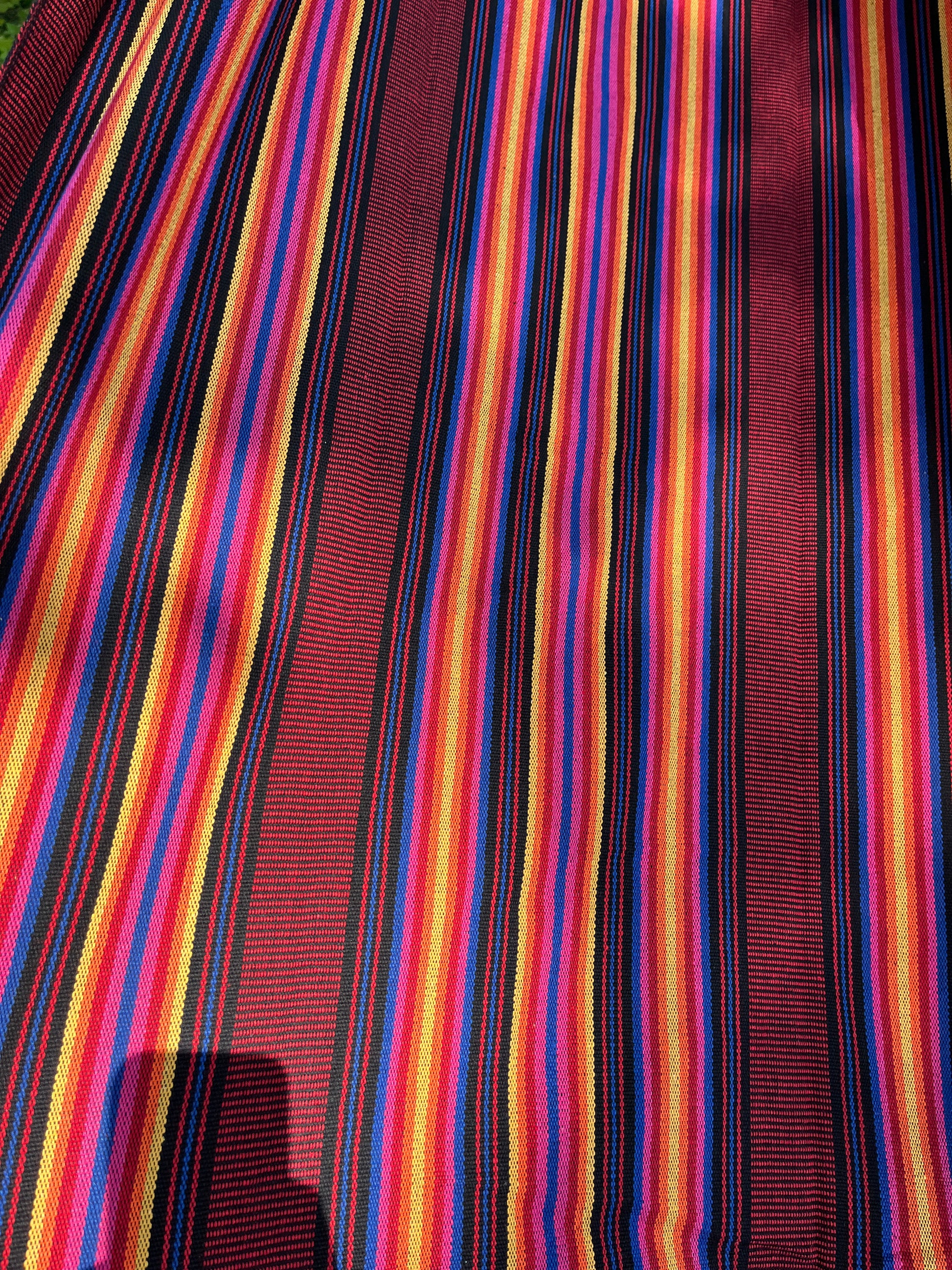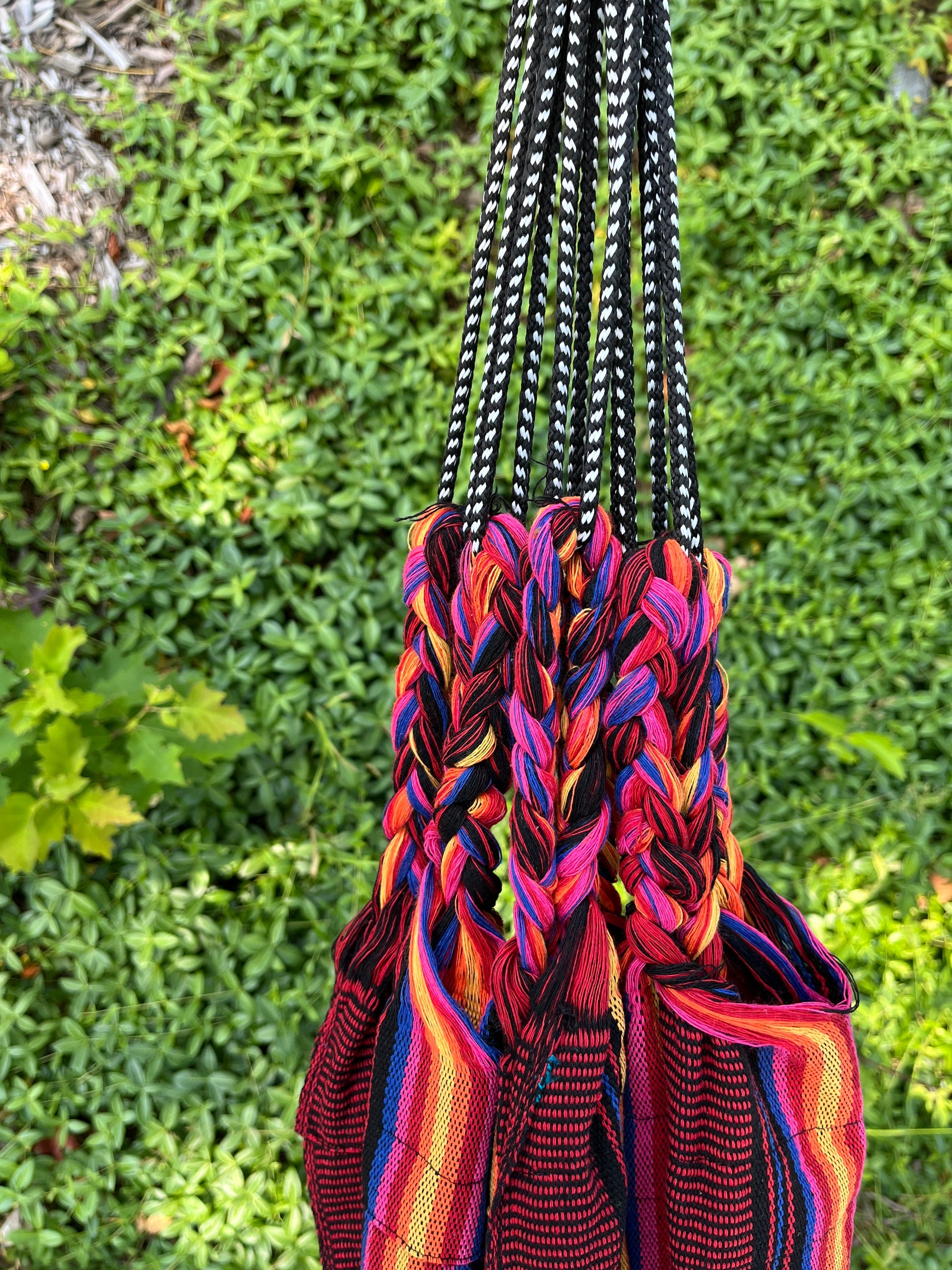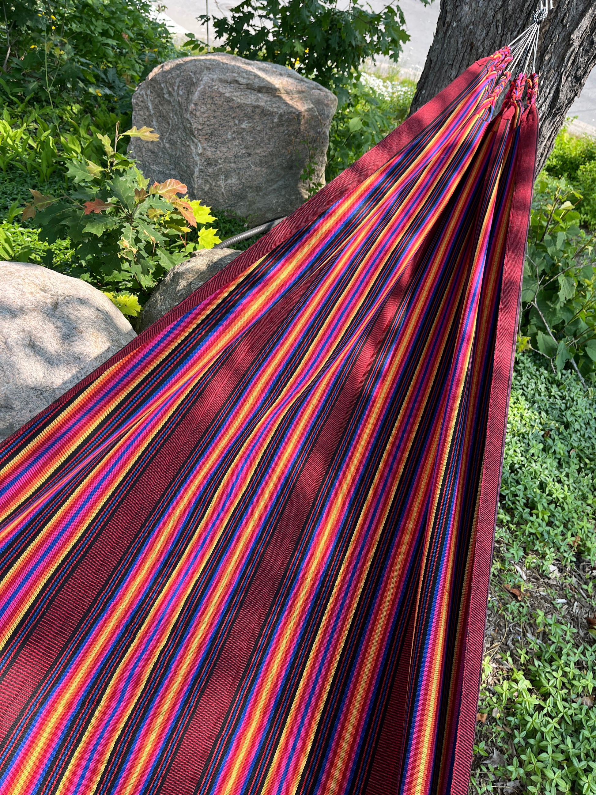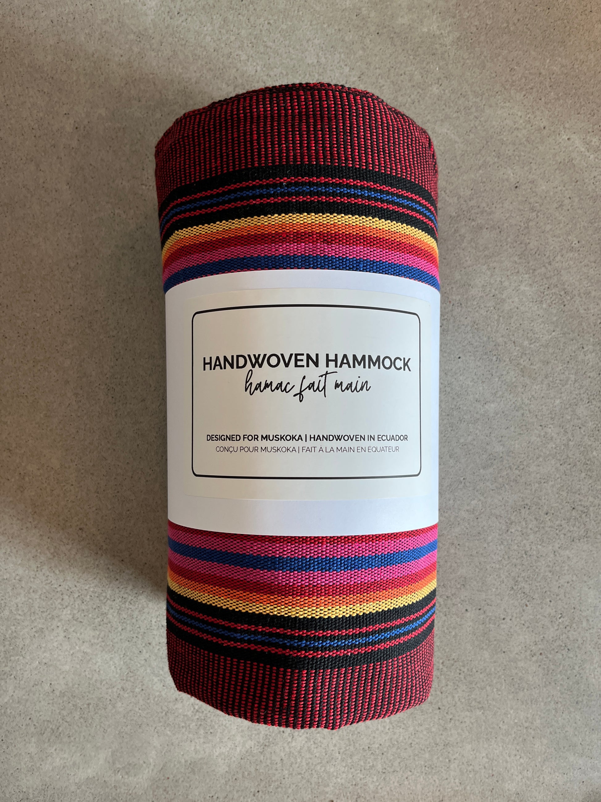 Unwind in style with this vibrant handwoven hammock, crafted on a vintage loom in the heart of Ecuador. Featuring bold stripes, each piece is a unique expression of traditional craftsmanship and modern durability. The body is made from soft, breathable cotton for ultimate comfort, while the suspension ropes are woven from strong polyester to ensure long-lasting use and weather resistance.