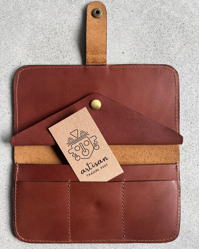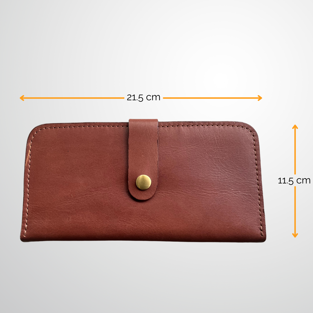 Notre portefeuille en cuir est un autre favori des fans en raison de son design minimaliste classique et de son cuir pleine fleur de haute qualité. Il dispose de cinq poches et d'une grande poche à bouton-pression et se marie parfaitement avec n'importe lequel de nos sacs faits main. Nous avons cinq variétés de couleurs différentes au choix.