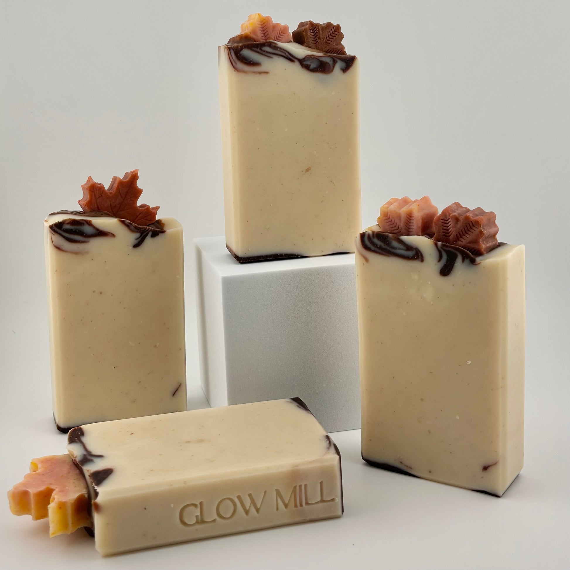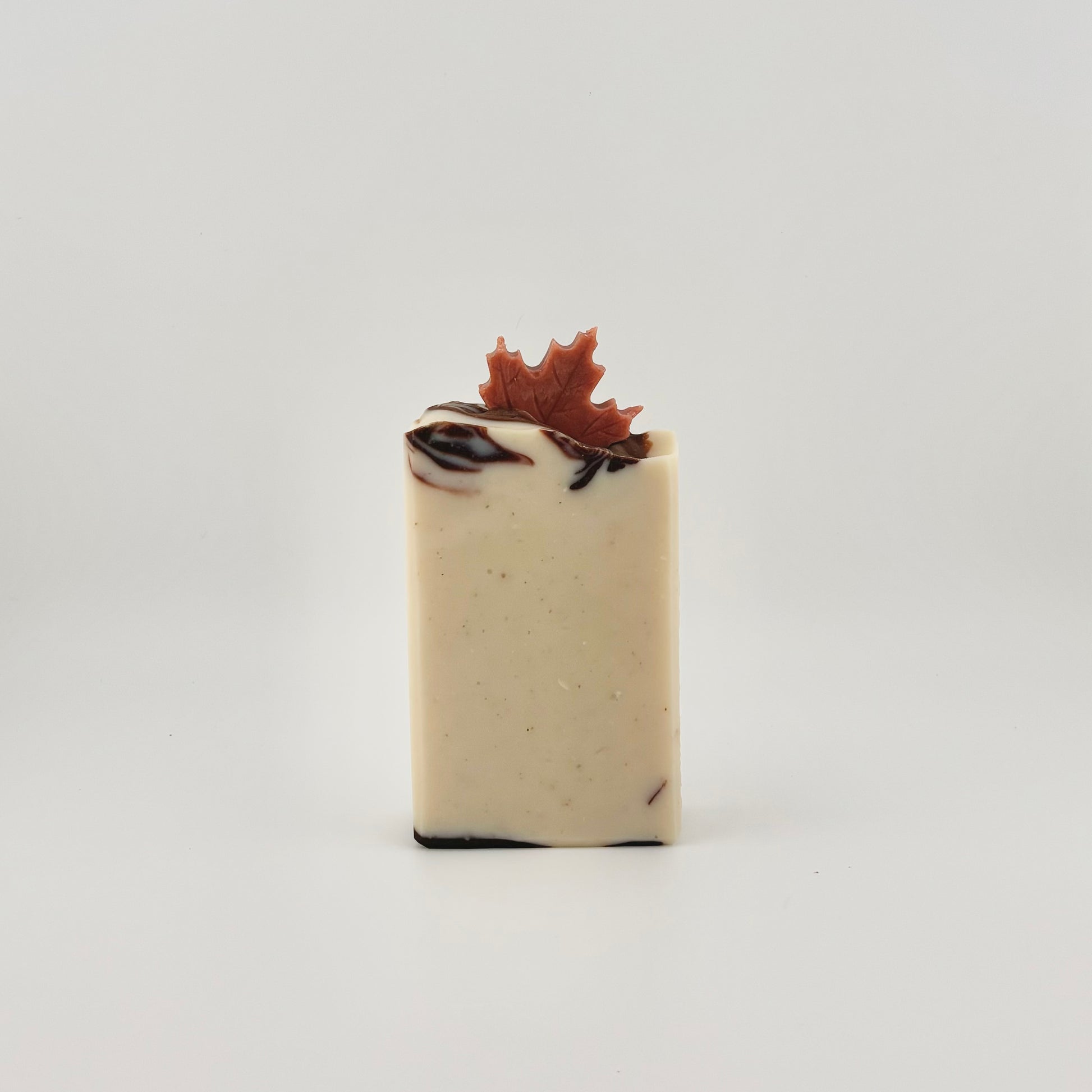 Ce pain de savon de luxe pèse environ 144 grammes. Il contient un magnifique mélange d'huiles essentielles : encens, orange douce et cannelle (une ambiance de pain perdu sur la terrasse). Chaque pain est garni d'une ou deux mini feuilles d'érable artisanales et entièrement naturelles (également fabriquées à partir de savon) avec des colorants naturels de curcuma, de poudre de cacao ou de poudre de racine de garance.
