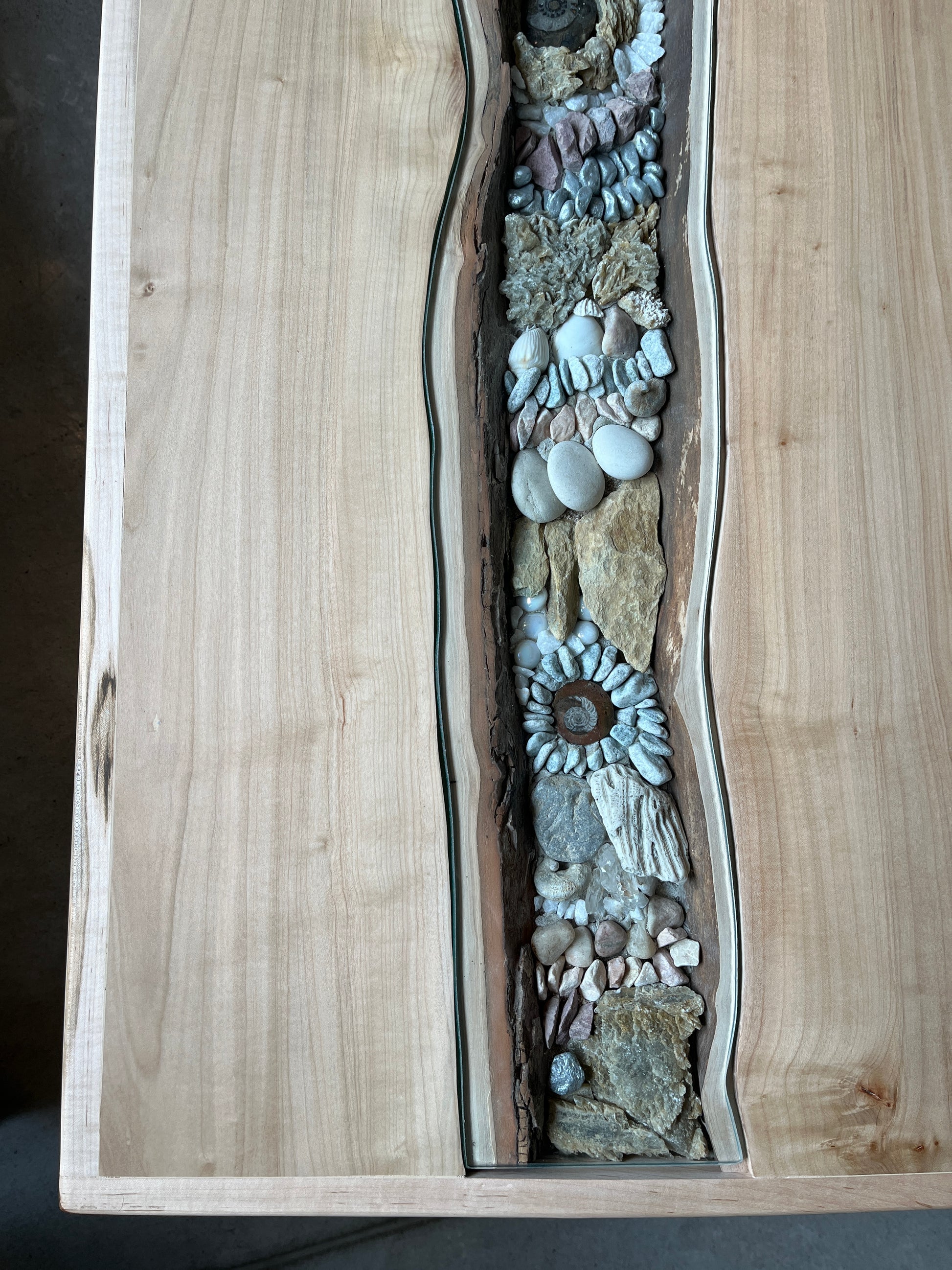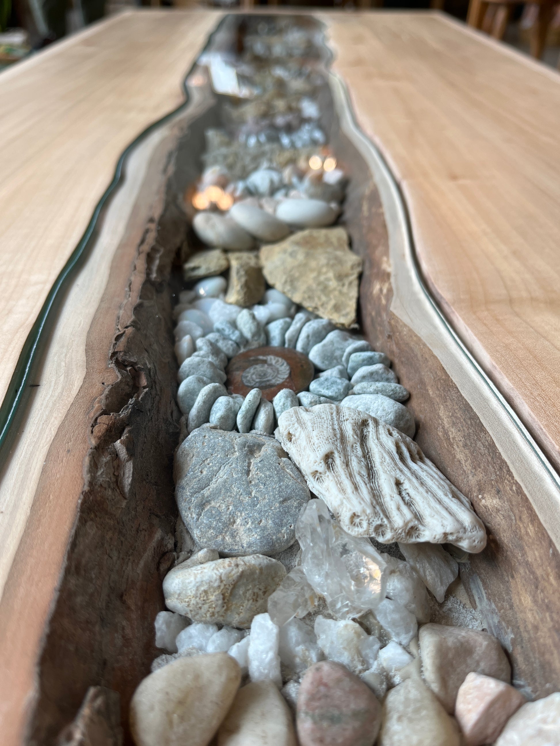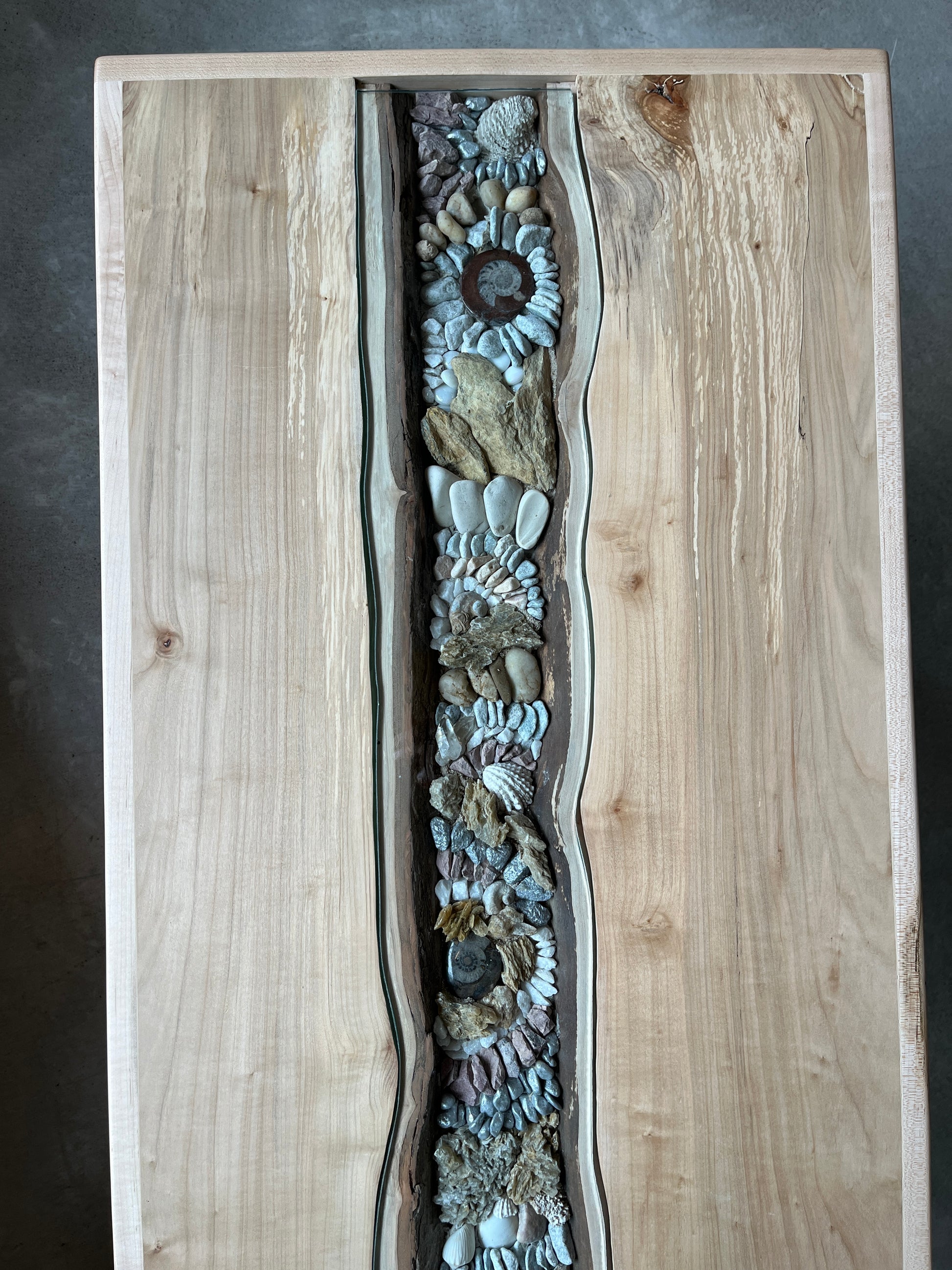 This unique table by Live Edge Forest, based in Port Carling, is a stunning piece of functional art that will bring natural elements of beauty into your home. The white legs and soft maple wood tones will freshen up your space. The signature stone art in the center of the table, carefully encased by a custom piece of tempered glass, echoes the movement of a beautiful flowing river.