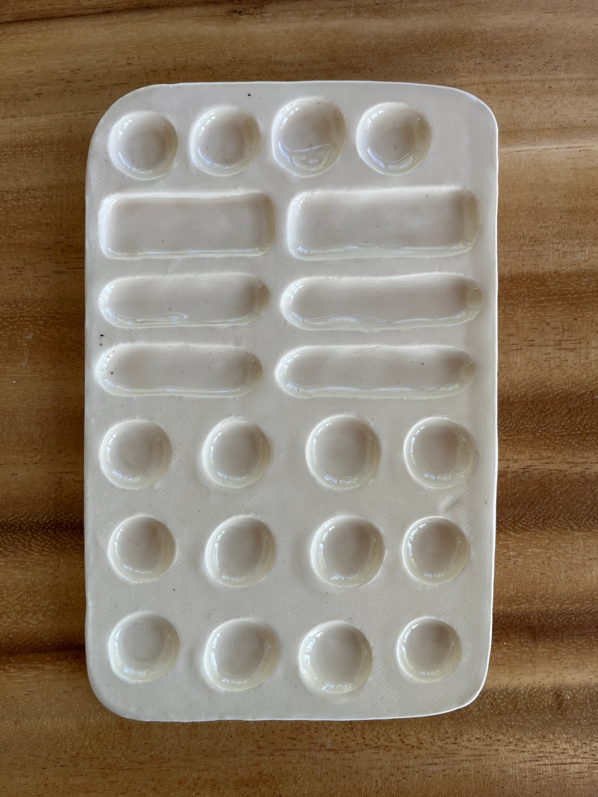 Handcrafted with care in Guelph, Ontario, by potter Elise Chung, these ceramic paint palettes are both functional and beautiful. Each palette is thoughtfully designed with a mix of round and rectangular wells—perfect for mixing washes, separating pigments, and keeping colours clean while you work.