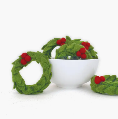 Beautiful handcrafted Christmas ornaments made from 100% New Zealand wool. Each felted leaf is cut by hand, then added to a wire frame and finished off with three tiny red berries. These wreaths are the perfect addition to your Christmas and holiday decor, tiered trays and gift wrap collection. All felt pieces are handcrafted by fair trade artisans in Nepal and assembled and packaged with love in New Jersey. Please note: price is for one wreath.