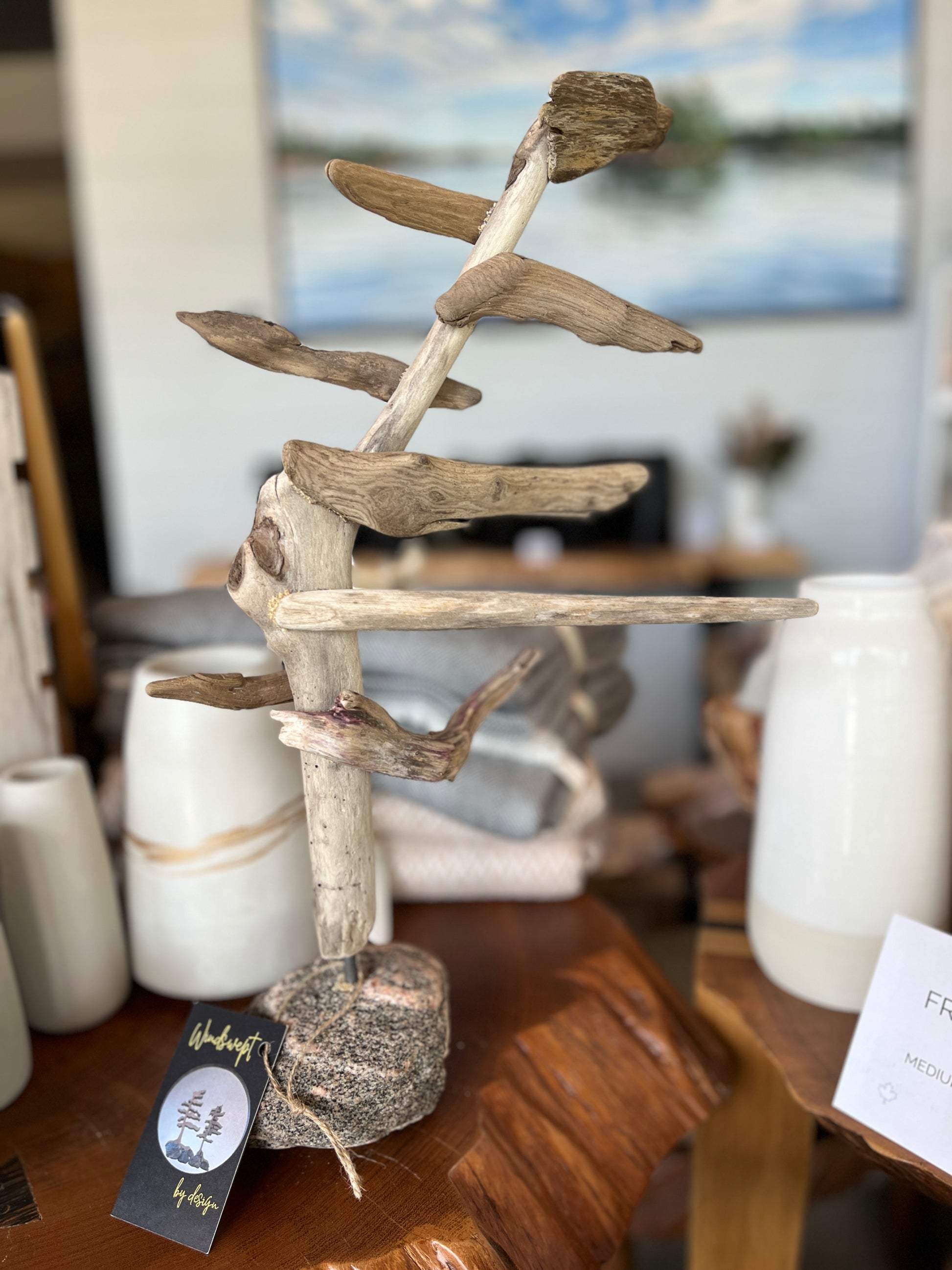 Transform your living space with our stunning Large Windswept Pine Driftwood Sculpture. Handcrafted by local artisan Michelle Milligan from natural driftwood, this windswept pine sculpture brings a touch of nature indoors. Its unique design creates a sense of movement and adds a rustic charm to any room. Elevate your home decor with this beautiful and one-of-a-kind piece.